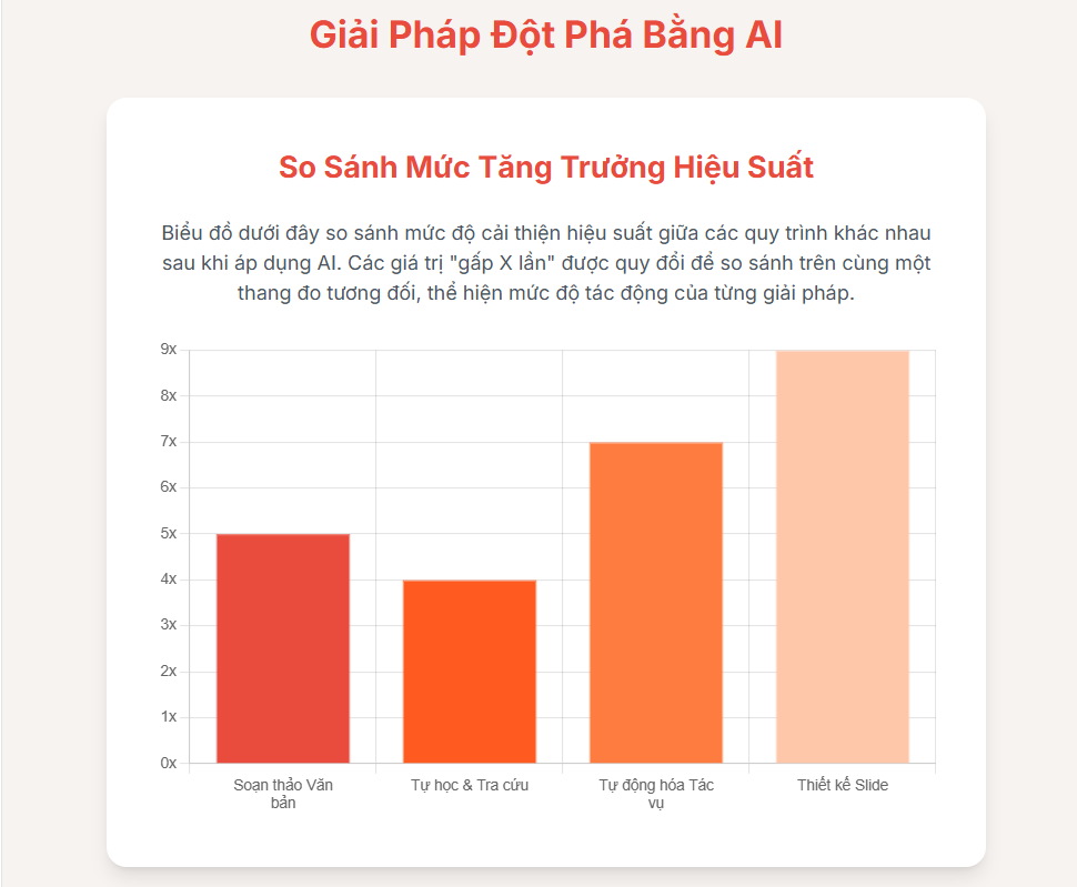 - Giải pháp ứng dụng AI: Giải pháp này giải quyết trực diện thách thức “thiết kế slide chưa đẹp, còn chậm” và các tác vụ Tổng hợp dữ liệu, Tạo biểu đồ, Thiết kế slide đã phân tích tại mục 1.3.